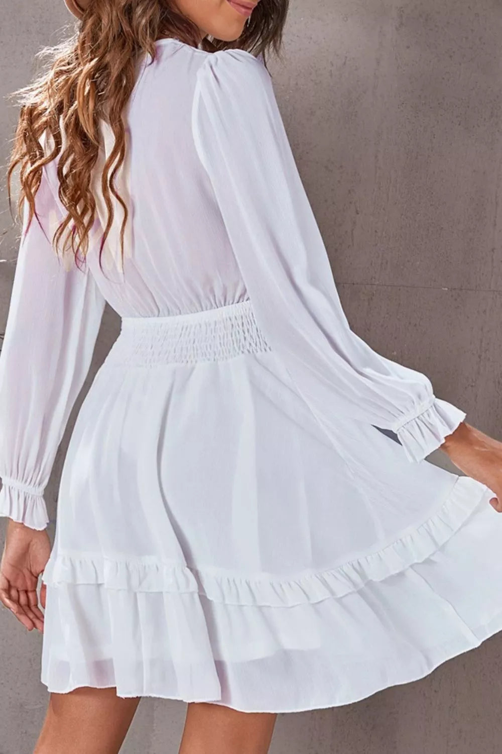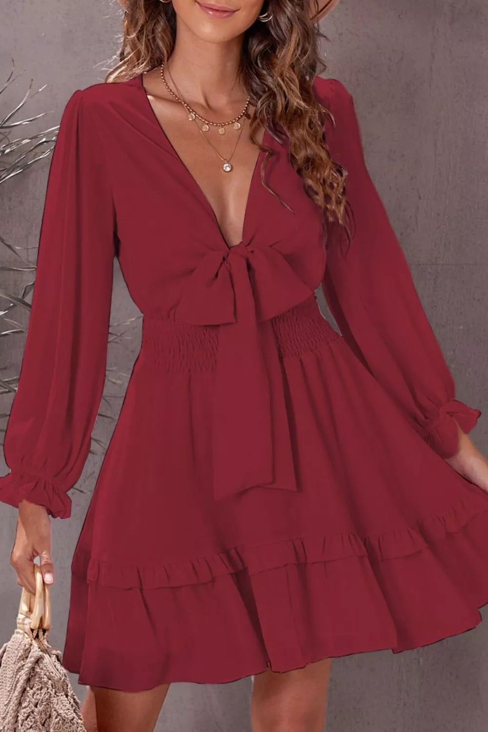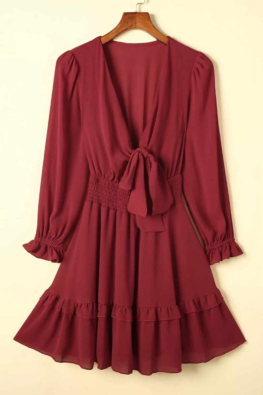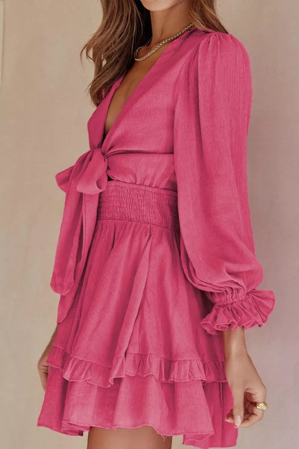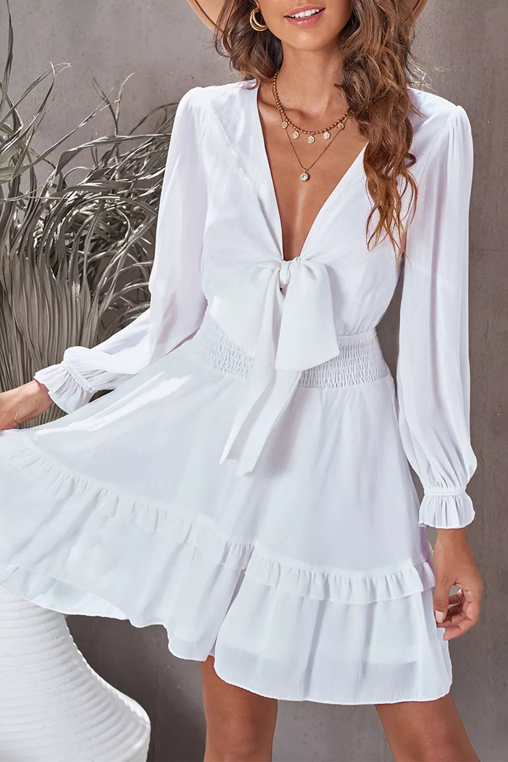 Elegant Tie-Front Ruffle Mini Dress with Smocked Wiast