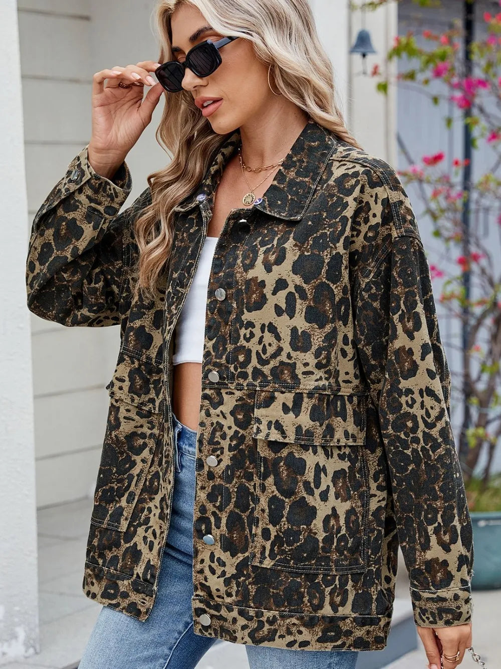 Leopard Button Up Drop Shoulder Denim Jacket
